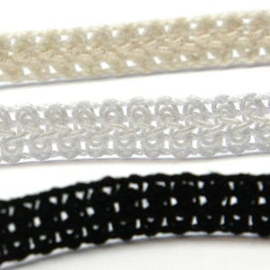• SHINDO社製(S.I.C.)コットンレースブレードです。天然繊維の綿100%で作られた、優しく温かみのある手編みレース調のブレードです。通常のレースよりも耐久性のある作りですので、子供向けの衣料品や縁飾りにも使いやすいのも特徴の一つです。シンプルなデザインながら華やかさもあり、インテリアや雑貨などのワンポイントアクセントにオススメです。※メートルカット品は、実物確認用のサンプルまたはご試作用途向けに販売をいたしております(数量「3」でお求めいただくと、3メートルを1本でお届け)。巻でのご購入前に必ずメートルカット品にて実物をご確認ください。