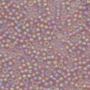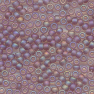 ミユキ社製のシードビーズで、スリガラスのようにツヤ消し加工(フロスト加工)したビーズ表面に虹色の光彩(レインボー)をかけた商品シリーズとなります。特小(15/0サイズ)では 20グラムで約5,000粒、糸に通すと約5メートル、丸小(11/0サイズ)では20グラムで約2,200粒、糸に通すと約2.6メートル、丸大(8/0サイズ)では20グラムで約780粒、糸に通すと約1.5メートル、特大(6/0サイズ)では20グラムで約240粒、糸に通すと約0.6メートルほどの量のバラビーズです。