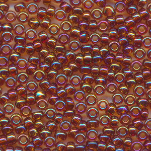 ミユキ社製のシードビーズで、表面に虹色の光彩(レインボー)をかけた商品シリーズとなります。特小(15/0サイズ)では 20グラムで約5,000粒、糸に通すと約5メートル、丸小(11/0サイズ)では20グラムで約2,200粒、糸に通すと約2.6メートルほどの量のバラビーズです。
