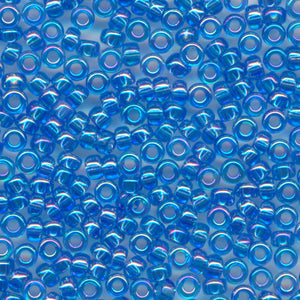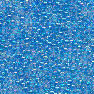 ミユキ社製のシードビーズで、表面に虹色の光彩(レインボー)をかけた商品シリーズとなります。特小(15/0サイズ)では 20グラムで約5,000粒、糸に通すと約5メートル、丸小(11/0サイズ)では20グラムで約2,200粒、糸に通すと約2.6メートルほどの量のバラビーズです。