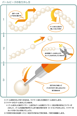 ユリア樹脂にパール加工を施した人工パールビーズです。日本製のオーソドックスな丸いラウンドタイプの両穴ビーズで、加工時のワイヤー通しの状態でのお届けとなります。塗装による穴の目詰まりやバリがある場合は、「パールビーズの取り外し方」をご参考になさっていただき、目打ちや針、ビーズ用リーマーなどで余剰な塗装部分を取り除いてからご使用ください。