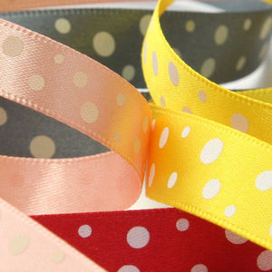 SHINDO社製(S.I.C.)ドットプリントリボン(両面サテン)です。両面サテンリボンの片面に水玉模様をプリントしたリボンで、ヘアリボンやお菓子屋(ケーキ屋)さんのラッピングリボンなどにもオススメの可愛らしさとポップな大小ドットが魅力の服飾資材です。※メートルカット品は、実物確認用のサンプルまたはご試作用途向けに販売をいたしております(数量「3」でお求めいただくと、3メートルを1本でお届け)。巻でのご購入前に必ずメートルカット品にて実物をご確認ください。