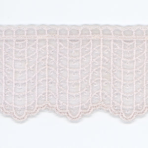 SHINDO社製(S.I.C.)チュールエンブロイダリーレースです。編みレースと刺繍レースを組み合わせ、軽やかなチュールの編み目と細やかな刺繍とのハーモニーが美しい、格子状のウエーブライン柄レースです。カジュアル衣料やダンス衣装、子供服、インテリア雑貨などのご用途向けにオススメです。また、染色や洗濯時の収縮を最小限に抑えるために、生成りを含む全てのカラーに防縮加工が施されておりますので、生地に縫い付けたレースが洗濯したらすごく縮んでしまった...(T_T) といった惨事を回避できます。※メートルカット品は、実物確認用のサンプルまたはご試作用途向けに販売をいたしております(数量「3」でお求めいただくと、3メートルを1本でお届け)。巻でのご購入前に必ずメートルカット品にて実物をご確認ください。