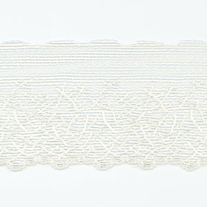 SHINDO社製(S.I.C.)チュールエンブロイダリーレースです。編みレースと刺繍レースを組み合わせ、軽やかなチュールの編み目と細やかな刺繍とのハーモニーが美しい、片側スカラップのレースです。カジュアル衣料やダンス衣装、子供服、インテリア雑貨などのご用途向けにオススメです。また、染色や洗濯時の収縮を最小限に抑えるために、生成りを含む全てのカラーに防縮加工が施されておりますので、生地に縫い付けたレースが洗濯したらすごく縮んでしまった...(T_T) といった惨事を回避できます。※メートルカット品は、実物確認用のサンプルまたはご試作用途向けに販売をいたしております(数量「3」でお求めいただくと、3メートルを1本でお届け)。巻でのご購入前に必ずメートルカット品にて実物をご確認ください。