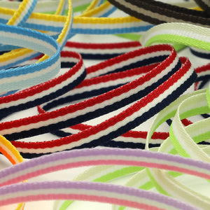 SHINDO社製(S.I.C.)ストライプグログランリボンです。ハリがあり、しっかりとした織上がりの極細グログランリボンで、フラッグカラーやペールトーンカラーなど、3色または2色のストライプ柄が特徴です。特に子ども服などのキッズアパレルとの相性がとても良くオススメのご用途になります。※メートルカット品は、実物確認用のサンプルまたはご試作用途向けに販売をいたしております(数量「3」でお求めいただくと、3メートルを1本でお届け)。巻でのご購入前に必ずメートルカット品にて実物をご確認ください。