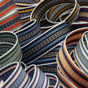 SHINDO社製(S.I.C.)ストライプグログランリボンです。太さの異なるライン巾にクラシカルなカラー配色した3色ストライプ柄が特徴のリボンで、子ども服やカジュアル衣料、帽子やバッグなどの雑貨用途向けにオススメです。※メートルカット品は、実物確認用のサンプルまたはご試作用途向けに販売をいたしております(数量「3」でお求めいただくと、3メートルを1本でお届け)。巻でのご購入前に必ずメートルカット品にて実物をご確認ください。