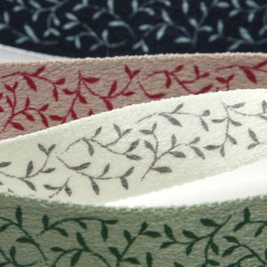 • SHINDO社製(S.I.C.)リーフプリントリボン(プルミエテープ)です。柔らかで手触りの良いスエード調のテープ(プルミエテープ)片面にリーフ柄がプリントされたリボンで、服飾やアクセサリー用途など様々なシーンでお使いいただける副資材です。※メートルカット品は、実物確認用のサンプルまたはご試作用途向けに販売をいたしております(数量「3」でお求めいただくと、3メートルを1本でお届け)。巻でのご購入前に必ずメートルカット品にて実物をご確認ください。