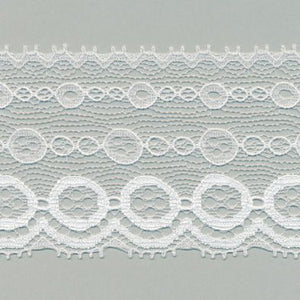 SHINDO社製(S.I.C.)ジャガードトリミングレースです。ラッセル織機で織られたボタンが連なったような柄のレースで、複雑かつ繊細な模様でも薄く平らなことも特徴の一つです。カジュアル衣料やダンス衣装、アンダーウエア、子供服、インテリア雑貨などのご用途向けにオススメです。また、染色や洗濯時の収縮を最小限に抑えるために、生成りを含む全てのカラーに防縮加工が施されておりますので、生地に縫い付けたレースが洗濯したらすごく縮んでしまった...(T_T) といった惨事を回避できます。※メートルカット品は、実物確認用のサンプルまたはご試作用途向けに販売をいたしております(数量「3」でお求めいただくと、3メートルを1本でお届け)。巻でのご購入前に必ずメートルカット品にて実物をご確認ください。