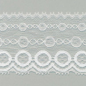 SHINDO社製(S.I.C.)ジャガードトリミングレースです。ラッセル織機で織られたボタンが連なったような柄のレースで、複雑かつ繊細な模様でも薄く平らなことも特徴の一つです。カジュアル衣料やダンス衣装、アンダーウエア、子供服、インテリア雑貨などのご用途向けにオススメです。また、染色や洗濯時の収縮を最小限に抑えるために、生成りを含む全てのカラーに防縮加工が施されておりますので、生地に縫い付けたレースが洗濯したらすごく縮んでしまった...(T_T) といった惨事を回避できます。※メートルカット品は、実物確認用のサンプルまたはご試作用途向けに販売をいたしております(数量「3」でお求めいただくと、3メートルを1本でお届け)。巻でのご購入前に必ずメートルカット品にて実物をご確認ください。