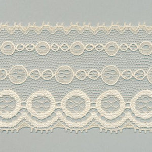 SHINDO社製(S.I.C.)ジャガードトリミングレースです。ラッセル織機で織られたボタンが連なったような柄のレースで、複雑かつ繊細な模様でも薄く平らなことも特徴の一つです。カジュアル衣料やダンス衣装、アンダーウエア、子供服、インテリア雑貨などのご用途向けにオススメです。また、染色や洗濯時の収縮を最小限に抑えるために、生成りを含む全てのカラーに防縮加工が施されておりますので、生地に縫い付けたレースが洗濯したらすごく縮んでしまった...(T_T) といった惨事を回避できます。※メートルカット品は、実物確認用のサンプルまたはご試作用途向けに販売をいたしております(数量「3」でお求めいただくと、3メートルを1本でお届け)。巻でのご購入前に必ずメートルカット品にて実物をご確認ください。