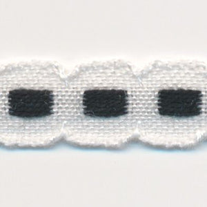 SHINDO社製(S.I.C.)チロルテープです。ボックスステッチが可愛らしく、またリボンの両端(上端と下端)に白いラインが入っているので、アクセントとして映えるリボンです。子供服や小物などの雑貨向けにオススメの服飾資材です。※メートルカット品は、実物確認用のサンプルまたはご試作用途向けに販売をいたしております(数量「3」でお求めいただくと、3メートルを1本でお届け)。巻でのご購入前に必ずメートルカット品にて実物をご確認ください。