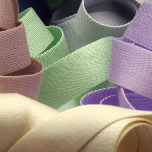 SHINDO社製(S.I.C.)コットンニットテープです。細番手で光沢のある綿100%糸を繊細に編み上げた高級感のあるニットテープで、天然素材ならではのナチュラル感はもちろん、上品な光沢感と柔らかく優しいタッチが特徴です。カジュアル衣料や雑貨向けのご用途にオススメの資材です。9x9mmサイズはバインダー(テープ中央部に折れ目加工が施されており、袖や裾部分などの布端を容易に挟み込み、縁取りテープとして簡単&綺麗に縫い付けられるテープ)タイプです。※メートルカット品は、実物確認用のサンプルまたはご試作用途向けに販売をいたしております(数量「3」でお求めいただくと、3メートルを1本でお届け)。巻でのご購入前に必ずメートルカット品にて実物をご確認ください。