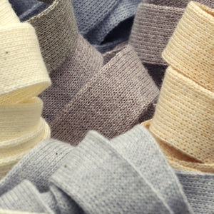 SHINDO社製(S.I.C.)コットンミングルテープです。原綿(糸)の染め分けにより優しい色目でも奥行きのある杢調に仕上げ、また杢表現することでコットンでありながら秋冬にも使用できるテープです。ソフトで上品な雰囲気があり、子供服などの肌に優しいテープとして人気があります。9×9mmと12x12mmサイズはバインダー(テープ中央部に折れ目加工が施されており、袖や裾部分などの布端を容易に挟み込み、縁取りテープとして簡単&綺麗に縫い付けられるテープ)タイプです。※メートルカット品は、実物確認用のサンプルまたはご試作用途向けに販売をいたしております(数量「3」でお求めいただくと、3メートルを1本でお届け)。巻でのご購入前に必ずメートルカット品にて実物をご確認ください。