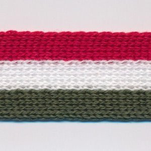 SHINDO社製(S.I.C.)コットンニットテープ(ストライプ)です。天然繊維の綿100%で作られた、フラッグカラーなどの3色または2色のストライプ柄のニットテープです。ニット組織ならではの伸びがあり、ストレッチ性の生地とのあわせなど、子供服やメンズカジュアル衣料へのご用途にオススメの商品です。※メートルカット品は、実物確認用のサンプルまたはご試作用途向けに販売をいたしております(数量「3」でお求めいただくと、3メートルを1本でお届け)。巻でのご購入前に必ずメートルカット品にて実物をご確認ください。