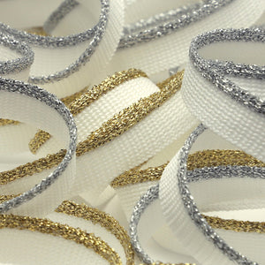 SHINDO社製(S.I.C.)ニットラメパイピングです。太めのラメ糸を使用した、華やかでゴージャスな輝きのニットパイピングで、ジャケットやアウター、レディース製品など布の裁ち目や合わせの装飾にオススメのテープです。※メートルカット品は、実物確認用のサンプルまたはご試作用途向けに販売をいたしております(数量「3」でお求めいただくと、3メートルを1本でお届け)。巻でのご購入前に必ずメートルカット品にて実物をご確認ください。