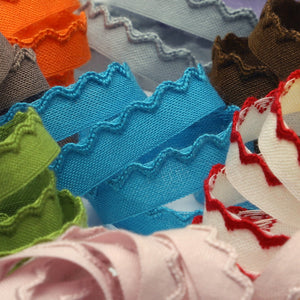 SHINDO社製(S.I.C.)チロルテープです。シンプルな片側スカラップのリボンで、フリルのようなボリューム感はありませんが、さりげない装飾として子供服や小物雑貨などの縁取りテープにオススメです。※メートルカット品は、実物確認用のサンプルまたはご試作用途向けに販売をいたしております(数量「3」でお求めいただくと、3メートルを1本でお届け)。巻でのご購入前に必ずメートルカット品にて実物をご確認ください。