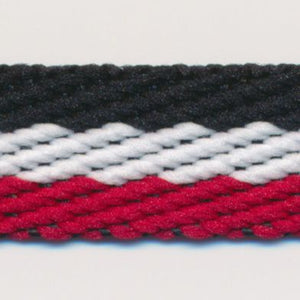 SHINDO社製(S.I.C.)ストライプツイルテープです。斜めの織り目とトリコロール柄などの3色、または2色のストライプ柄が特徴的な綾織りリボンで、一般的なリボンより若干ながら厚みがあり、柔らかな風合いがあるのもオススメオススメポイントです。パーカーなどのフードコードや、シャツの前立て、カットソーの衿伏せテープなどにもよくご使用いただいている資材です。※メートルカット品は、実物確認用のサンプルまたはご試作用途向けに販売をいたしております(数量「3」でお求めいただくと、3メートルを1本でお届け)。巻でのご購入前に必ずメートルカット品にて実物をご確認ください。