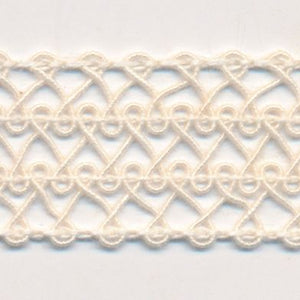 SHINDO社製(S.I.C.)コットンレースブレードです。天然繊維の綿100%で作られた、優しく温かみのある手編みレース調のブレードです。通常のレースよりも耐久性のある作りですので、子供向けの衣料品や縁飾りにも使いやすいのも特徴の一つです。シンプルなデザインながら華やかさもあり、インテリアや雑貨などのワンポイントアクセントにオススメです。※メートルカット品は、実物確認用のサンプルまたはご試作用途向けに販売をいたしております(数量「3」でお求めいただくと、3メートルを1本でお届け)。巻でのご購入前に必ずメートルカット品にて実物をご確認ください。