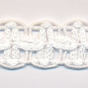 SHINDO社製(S.I.C.)コットンレースブレードです。天然繊維の綿100%で作られた、優しく温かみのある手編みレース調のブレードです。通常のレースよりも耐久性のある作りですので、子供向けの衣料品や縁飾りにも使いやすいのも特徴の一つです。シンプルなデザインながら華やかさもあり、インテリアや雑貨などのワンポイントアクセントにオススメです。※メートルカット品は、実物確認用のサンプルまたはご試作用途向けに販売をいたしております(数量「3」でお求めいただくと、3メートルを1本でお届け)。巻でのご購入前に必ずメートルカット品にて実物をご確認ください。