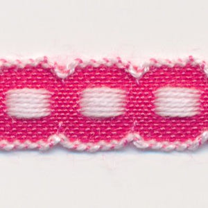 SHINDO社製(S.I.C.)チロルテープです。ボックスステッチが可愛らしく、またリボンの両端(上端と下端)に白いラインが入っているので、アクセントとして映えるリボンです。子供服や小物などの雑貨向けにオススメの服飾資材です。※メートルカット品は、実物確認用のサンプルまたはご試作用途向けに販売をいたしております(数量「3」でお求めいただくと、3メートルを1本でお届け)。巻でのご購入前に必ずメートルカット品にて実物をご確認ください。