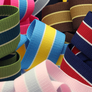 SHINDO社製(S.I.C.)ニットラインテープです。薄手の3色ストライプ柄(2色ストイプに見えますが、中央カラー両サイドにアクセントカラーが配されています)の片面ニットテープで、適度な伸縮性がありジャージーなどのストレッチ性のある生地との相性が良くオススメです。※メートルカット品は、実物確認用のサンプルまたはご試作用途向けに販売をいたしております(数量「3」でお求めいただくと、3メートルを1本でお届け)。巻でのご購入前に必ずメートルカット品にて実物をご確認ください。