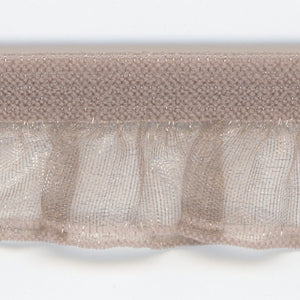SHINDO社製(S.I.C.)シングルフリルストレッチです。透け感のあるオーガンジーフリルの縁に2本のラインが施され、よりフリルのラインが強調された伸縮性フリルテープです。ナイロン素材ならではの光沢感や軽やかさがあり、薄手の身生地との相性が良いのも特徴の一つです。カジュアル衣料や雑貨向けなどのご用途にオススメです。※メートルカット品は、実物確認用のサンプルまたはご試作用途向けに販売をいたしております(数量「3」でお求めいただくと、3メートルを1本でお届け)。巻でのご購入前に必ずメートルカット品にて実物をご確認ください。