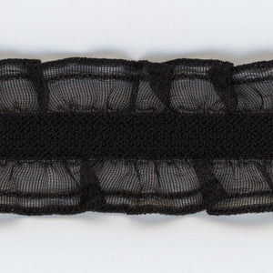 SHINDO社製(S.I.C.)ダブルフリルストレッチです。透け感のあるオーガンジーフリルの縁に2本のラインが施され、よりフリルのラインが強調された両端がフリル仕様の伸縮性テープです。ナイロン素材ならではの光沢感や軽やかさがあり、薄手の身生地との相性が良いのも特徴の一つです。カジュアル衣料や雑貨向けなどのご用途にオススメです。※メートルカット品は、実物確認用のサンプルまたはご試作用途向けに販売をいたしております(数量「3」でお求めいただくと、3メートルを1本でお届け)。巻でのご購入前に必ずメートルカット品にて実物をご確認ください。