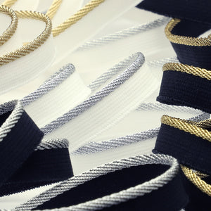 SHINDO社製(S.I.C.)メタリックストレッチパイピングです。パイピングの玉部分に金色と銀色、縫い代がそれぞれホワイトとブラックでご用意したオーソドックスなラメパイピングです。ラメ糸は比較的硬いため、通常のラメパイピングではカーブ分の縫製に難がありますが、こちらのテープは伸縮性がありますのでカーブにもついていき、縫製がしやすく、綺麗に仕上がります。ジャケットやアウター、レディース製品など布の裁ち目や合わせの装飾にオススメの資材です。※メートルカット品は、実物確認用のサンプルまたはご試作用途向けに販売をいたしております(数量「3」でお求めいただくと、3メートルを1本でお届け)。巻でのご購入前に必ずメートルカット品にて実物をご確認ください。