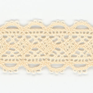 SHINDO社製(S.I.C.)トーションレースです。天然繊維の綿100%で作られた、素朴で温かみのあるナチュラルテイストで連なるダイヤ柄と両端ピコットのレースです。細番手の糸を使用しており、軽やかで繊細な風合いも特徴の一つで、子供服や雑貨向けのご用途におススメの資材です。また、染色や洗濯時の収縮を最小限に抑えるために、生成りを含む全てのカラーに防縮加工が施されておりますので、生地に縫い付けたレースが洗濯したらすごく縮んでしまった...(T_T) といった惨事を回避できます。※メートルカット品は、実物確認用のサンプルまたはご試作用途向けに販売をいたしております(数量「3」でお求めいただくと、3メートルを1本でお届け)。巻でのご購入前に必ずメートルカット品にて実物をご確認ください。
