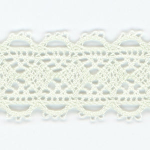 • SHINDO社製(S.I.C.)トーションレースです。天然繊維の綿100%で作られた、素朴で温かみのあるナチュラルテイストで連なるダイヤ柄と両端ピコットのレースです。細番手の糸を使用しており、軽やかで繊細な風合いも特徴の一つで、子供服や雑貨向けのご用途におススメの資材です。また、染色や洗濯時の収縮を最小限に抑えるために、生成りを含む全てのカラーに防縮加工が施されておりますので、生地に縫い付けたレースが洗濯したらすごく縮んでしまった...(T_T) といった惨事を回避できます。※メートルカット品は、実物確認用のサンプルまたはご試作用途向けに販売をいたしております(数量「3」でお求めいただくと、3メートルを1本でお届け)。巻でのご購入前に必ずメートルカット品にて実物をご確認ください。