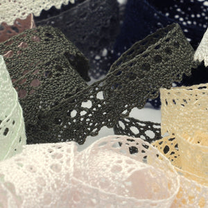 SHINDO社製(S.I.C.)トーションレースです。天然繊維の綿100%で作られた、素朴で温かみのあるナチュラルテイストのレースです。細番手の糸を使用しており、軽やかで繊細な風合いも特徴の一つで、子供服や雑貨向けのご用途におススメの資材です。また、染色や洗濯時の収縮を最小限に抑えるために、生成りを含む全てのカラーに防縮加工が施されておりますので、生地に縫い付けたレースが洗濯したらすごく縮んでしまった...(T_T) といった惨事を回避できます。※メートルカット品は、実物確認用のサンプルまたはご試作用途向けに販売をいたしております(数量「3」でお求めいただくと、3メートルを1本でお届け)。巻でのご購入前に必ずメートルカット品にて実物をご確認ください。