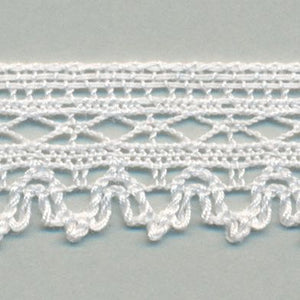 SHINDO社製(S.I.C.)トーションレースです。天然繊維の綿100%で作られた、素朴で温かみのあるナチュラルテイストで片側がピコットラインのレースです。細番手の糸を使用しており、軽やかで繊細な風合いも特徴の一つで、子供服や雑貨向けのご用途におススメの資材です。また、染色や洗濯時の収縮を最小限に抑えるために、生成りを含む全てのカラーに防縮加工が施されておりますので、生地に縫い付けたレースが洗濯したらすごく縮んでしまった...(T_T) といった惨事を回避できます。※メートルカット品は、実物確認用のサンプルまたはご試作用途向けに販売をいたしております(数量「3」でお求めいただくと、3メートルを1本でお届け)。巻でのご購入前に必ずメートルカット品にて実物をご確認ください。