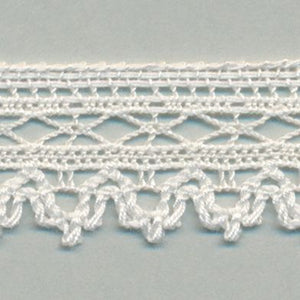 SHINDO社製(S.I.C.)トーションレースです。天然繊維の綿100%で作られた、素朴で温かみのあるナチュラルテイストで片側がピコットラインのレースです。細番手の糸を使用しており、軽やかで繊細な風合いも特徴の一つで、子供服や雑貨向けのご用途におススメの資材です。また、染色や洗濯時の収縮を最小限に抑えるために、生成りを含む全てのカラーに防縮加工が施されておりますので、生地に縫い付けたレースが洗濯したらすごく縮んでしまった...(T_T) といった惨事を回避できます。※メートルカット品は、実物確認用のサンプルまたはご試作用途向けに販売をいたしております(数量「3」でお求めいただくと、3メートルを1本でお届け)。巻でのご購入前に必ずメートルカット品にて実物をご確認ください。