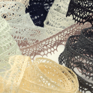 • SHINDO社製(S.I.C.)トーションレースです。天然繊維の綿100%で作られた、素朴で温かみのあるナチュラルテイストで片側ピコットのレースです。細番手の糸を使用しており、軽やかで繊細な風合いも特徴の一つで、子供服や雑貨向けのご用途におススメの資材です。また、染色や洗濯時の収縮を最小限に抑えるために、生成りを含む全てのカラーに防縮加工が施されておりますので、生地に縫い付けたレースが洗濯したらすごく縮んでしまった...(T_T) といった惨事を回避できます。※メートルカット品は、実物確認用のサンプルまたはご試作用途向けに販売をいたしております(数量「3」でお求めいただくと、3メートルを1本でお届け)。巻でのご購入前に必ずメートルカット品にて実物をご確認ください。