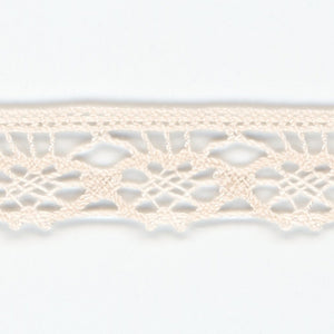 SHINDO社製(S.I.C.)トーションレースです。天然繊維の綿100%で作られた、素朴で温かみのあるナチュラルで和テイストのレースです。細番手の糸を使用しており、軽やかで繊細な風合いも特徴の一つで、子供服や雑貨向けのご用途におススメの資材です。また、染色や洗濯時の収縮を最小限に抑えるために、生成りを含む全てのカラーに防縮加工が施されておりますので、生地に縫い付けたレースが洗濯したらすごく縮んでしまった...(T_T) といった惨事を回避できます。※メートルカット品は、実物確認用のサンプルまたはご試作用途向けに販売をいたしております(数量「3」でお求めいただくと、3メートルを1本でお届け)。巻でのご購入前に必ずメートルカット品にて実物をご確認ください。