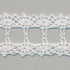 SHINDO社製(S.I.C.)トーションレースです。天然繊維の綿100%で作られた、素朴で温かみのあるナチュラルテイストでハシゴデザインが特徴のレースです。細番手の糸を使用しており、軽やかで繊細な風合いも特徴の一つで、子供服や雑貨向けのご用途におススメの資材です。また、染色や洗濯時の収縮を最小限に抑えるために、生成りを含む全てのカラーに防縮加工が施されておりますので、生地に縫い付けたレースが洗濯したらすごく縮んでしまった...(T_T) といった惨事を回避できます。※メートルカット品は、実物確認用のサンプルまたはご試作用途向けに販売をいたしております(数量「3」でお求めいただくと、3メートルを1本でお届け)。巻でのご購入前に必ずメートルカット品にて実物をご確認ください。