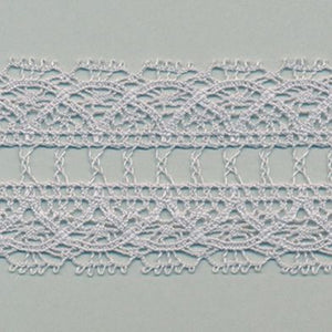 SHINDO社製(S.I.C.)トーションレースです。天然繊維の綿100%で作られた、素朴で温かみのあるナチュラルテイストでハシゴデザインが特徴のレースです。細番手の糸を使用しており、軽やかで繊細な風合いも特徴の一つで、子供服や雑貨向けのご用途におススメの資材です。また、染色や洗濯時の収縮を最小限に抑えるために、生成りを含む全てのカラーに防縮加工が施されておりますので、生地に縫い付けたレースが洗濯したらすごく縮んでしまった...(T_T) といった惨事を回避できます。※メートルカット品は、実物確認用のサンプルまたはご試作用途向けに販売をいたしております(数量「3」でお求めいただくと、3メートルを1本でお届け)。巻でのご購入前に必ずメートルカット品にて実物をご確認ください。