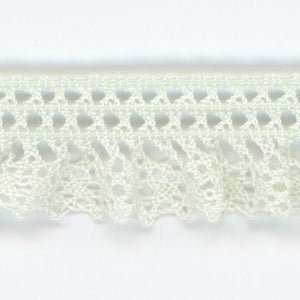 • SHINDO社製(S.I.C.)ストレッチトーションレースです。伸縮性のある小ぶりなフリルレースで、細番手の糸を使用しており、軽やかで繊細な風合いがあります。子供服や雑貨向けのご用途におススメの資材です。また、染色や洗濯時の収縮を最小限に抑えるために、生成りを含む全てのカラーに防縮加工が施されておりますので、生地に縫い付けたレースが洗濯したらすごく縮んでしまった...(T_T) といった惨事を回避できます。※メートルカット品は、実物確認用のサンプルまたはご試作用途向けに販売をいたしております(数量「3」でお求めいただくと、3メートルを1本でお届け)。巻でのご購入前に必ずメートルカット品にて実物をご確認ください。