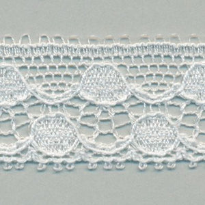 SHINDO社製(S.I.C.)リバートリミングレースです。緻密で細やかな2段のドット模様が特徴で、リバーレース織機は使用する糸数も多く、構造が複雑なため生産するには高い技術力が必要とされる技法の希少性の高いレースです。レディース衣料やダンス衣装、インテリアなどの雑貨向けのご用途にオススメです。また、染色や洗濯時の収縮を最小限に抑えるために、生成りを含む全てのカラーに防縮加工が施されておりますので、生地に縫い付けたレースが洗濯したらすごく縮んでしまった...(T_T) といった惨事を回避できます。※メートルカット品は、実物確認用のサンプルまたはご試作用途向けに販売をいたしております(数量「3」でお求めいただくと、3メートルを1本でお届け)。巻でのご購入前に必ずメートルカット品にて実物をご確認ください。