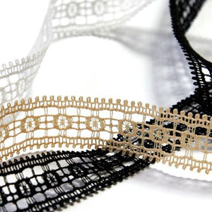 • SHINDO社製(S.I.C.)リバートリミングレースです。緻密で細やかなスクエアデザインが特徴で、リバーレース織機は使用する糸数も多く、構造が複雑なため生産するには高い技術力が必要とされる技法の希少性の高いレースです。レディース衣料やダンス衣装、インテリアなどの雑貨向けのご用途にオススメです。また、染色や洗濯時の収縮を最小限に抑えるために、生成りを含む全てのカラーに防縮加工が施されておりますので、生地に縫い付けたレースが洗濯したらすごく縮んでしまった...(T_T) といった惨事を回避できます。※メートルカット品は、実物確認用のサンプルまたはご試作用途向けに販売をいたしております(数量「3」でお求めいただくと、3メートルを1本でお届け)。巻でのご購入前に必ずメートルカット品にて実物をご確認ください。