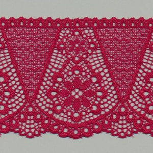 SHINDO社製(S.I.C.)ストレッチトリミングレースです。ラッセル織機で織られた伸縮性のあるダイナミックな模様のレースで、複雑かつ繊細な模様でも薄く平らなことも特徴の一つです。カジュアル衣料やダンス衣装、アンダーウエア、子供服、インテリア雑貨などのご用途向けにオススメです。また、染色や洗濯時の収縮を最小限に抑えるために、生成りを含む全てのカラーに防縮加工が施されておりますので、生地に縫い付けたレースが洗濯したらすごく縮んでしまった...(T_T) といった惨事を回避できます。※メートルカット品は、実物確認用のサンプルまたはご試作用途向けに販売をいたしております(数量「3」でお求めいただくと、3メートルを1本でお届け)。巻でのご購入前に必ずメートルカット品にて実物をご確認ください。