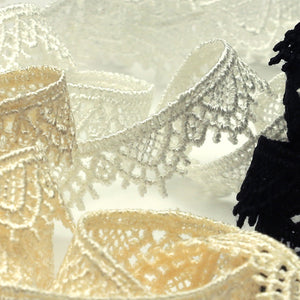 • SHINDO社製(S.I.C.)ケミカルエンブロイダリーレースです。刺繍でありながら糸を編んだような透け感が特徴の片側ピコットレースです。カジュアル衣料やダンス衣装、子供服、インテリア雑貨などのご用途向けにオススメです。また、染色や洗濯時の収縮を最小限に抑えるために、生成りを含む全てのカラーに防縮加工が施されておりますので、生地に縫い付けたレースが洗濯したらすごく縮んでしまった...(T_T) といった惨事を回避できます。※メートルカット品は、実物確認用のサンプルまたはご試作用途向けに販売をいたしております(数量「3」でお求めいただくと、3メートルを1本でお届け)。巻でのご購入前に必ずメートルカット品にて実物をご確認ください。