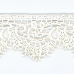 SHINDO社製(S.I.C.)ケミカルエンブロイダリーレースです。刺繍でありながら糸を編んだような透け感が特徴の片側ピコットレースです。カジュアル衣料やダンス衣装、子供服、インテリア雑貨などのご用途向けにオススメです。また、染色や洗濯時の収縮を最小限に抑えるために、生成りを含む全てのカラーに防縮加工が施されておりますので、生地に縫い付けたレースが洗濯したらすごく縮んでしまった...(T_T) といった惨事を回避できます。※メートルカット品は、実物確認用のサンプルまたはご試作用途向けに販売をいたしております(数量「3」でお求めいただくと、3メートルを1本でお届け)。巻でのご購入前に必ずメートルカット品にて実物をご確認ください。