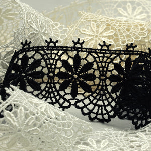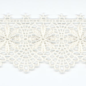SHINDO社製(S.I.C.)ケミカルエンブロイダリーレースです。刺繍でありながら糸を編んだような透け感が特徴のフローラル柄レースです。カジュアル衣料やダンス衣装、子供服、インテリア雑貨などのご用途向けにオススメです。また、染色や洗濯時の収縮を最小限に抑えるために、生成りを含む全てのカラーに防縮加工が施されておりますので、生地に縫い付けたレースが洗濯したらすごく縮んでしまった...(T_T) といった惨事を回避できます。※メートルカット品は、実物確認用のサンプルまたはご試作用途向けに販売をいたしております(数量「3」でお求めいただくと、3メートルを1本でお届け)。巻でのご購入前に必ずメートルカット品にて実物をご確認ください。