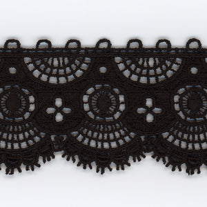 SHINDO社製(S.I.C.)ケミカルエンブロイダリーレースです。刺繍でありながら糸を編んだような透け感が特徴のモダンな柄のレースです。カジュアル衣料やダンス衣装、子供服、インテリア雑貨などのご用途向けにオススメです。また、染色や洗濯時の収縮を最小限に抑えるために、生成りを含む全てのカラーに防縮加工が施されておりますので、生地に縫い付けたレースが洗濯したらすごく縮んでしまった...(T_T) といった惨事を回避できます。※メートルカット品は、実物確認用のサンプルまたはご試作用途向けに販売をいたしております(数量「3」でお求めいただくと、3メートルを1本でお届け)。巻でのご購入前に必ずメートルカット品にて実物をご確認ください。