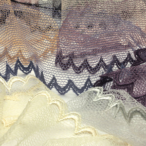 SHINDO社製(S.I.C.)チュールエンブロイダリーレースです。編みレースと刺繍レースを組み合わせ、軽やかなチュールの編み目と細やかな刺繍とのハーモニーが美しい、片側スカラップのレースです。カジュアル衣料やダンス衣装、子供服、インテリア雑貨などのご用途向けにオススメです。また、染色や洗濯時の収縮を最小限に抑えるために、生成りを含む全てのカラーに防縮加工が施されておりますので、生地に縫い付けたレースが洗濯したらすごく縮んでしまった...(T_T) といった惨事を回避できます。※メートルカット品は、実物確認用のサンプルまたはご試作用途向けに販売をいたしております(数量「3」でお求めいただくと、3メートルを1本でお届け)。巻でのご購入前に必ずメートルカット品にて実物をご確認ください。