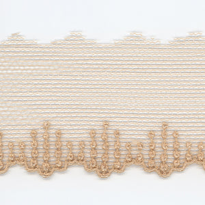 SHINDO社製(S.I.C.)チュールエンブロイダリーレースです。編みレースと刺繍レースを組み合わせ、軽やかなチュールの編み目と細やかな刺繍とのハーモニーが美しい、ドットスカラップのレースです。カジュアル衣料やダンス衣装、子供服、インテリア雑貨などのご用途向けにオススメです。また、染色や洗濯時の収縮を最小限に抑えるために、生成りを含む全てのカラーに防縮加工が施されておりますので、生地に縫い付けたレースが洗濯したらすごく縮んでしまった...(T_T) といった惨事を回避できます。※メートルカット品は、実物確認用のサンプルまたはご試作用途向けに販売をいたしております(数量「3」でお求めいただくと、3メートルを1本でお届け)。巻でのご購入前に必ずメートルカット品にて実物をご確認ください。