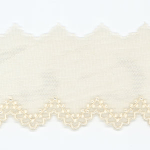 • SHINDO社製(S.I.C.)チュールエンブロイダリーレースです。編みレースと刺繍レースを組み合わせ、軽やかなチュールの編み目と細やかな刺繍とのハーモニーが美しい、ドットスカラップのレースです。カジュアル衣料やダンス衣装、子供服、インテリア雑貨などのご用途向けにオススメです。また、染色や洗濯時の収縮を最小限に抑えるために、生成りを含む全てのカラーに防縮加工が施されておりますので、生地に縫い付けたレースが洗濯したらすごく縮んでしまった...(T_T) といった惨事を回避できます。※メートルカット品は、実物確認用のサンプルまたはご試作用途向けに販売をいたしております(数量「3」でお求めいただくと、3メートルを1本でお届け)。巻でのご購入前に必ずメートルカット品にて実物をご確認ください。