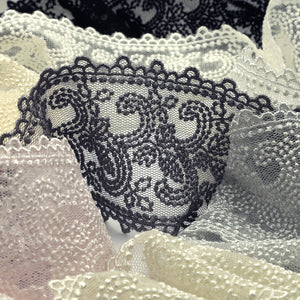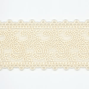 SHINDO社製(S.I.C.)チュールエンブロイダリーレースです。編みレースと刺繍レースを組み合わせ、軽やかなチュールの編み目と細やかな刺繍とのハーモニーが美しい、華やかな柄のレースです。カジュアル衣料やダンス衣装、子供服、インテリア雑貨などのご用途向けにオススメです。また、染色や洗濯時の収縮を最小限に抑えるために、生成りを含む全てのカラーに防縮加工が施されておりますので、生地に縫い付けたレースが洗濯したらすごく縮んでしまった...(T_T) といった惨事を回避できます。※メートルカット品は、実物確認用のサンプルまたはご試作用途向けに販売をいたしております(数量「3」でお求めいただくと、3メートルを1本でお届け)。巻でのご購入前に必ずメートルカット品にて実物をご確認ください。