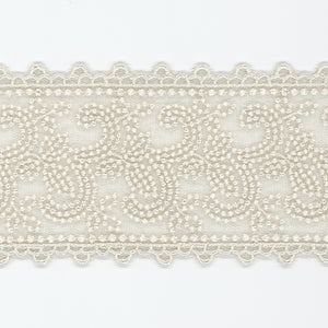 • SHINDO社製(S.I.C.)チュールエンブロイダリーレースです。編みレースと刺繍レースを組み合わせ、軽やかなチュールの編み目と細やかな刺繍とのハーモニーが美しい、華やかな柄のレースです。カジュアル衣料やダンス衣装、子供服、インテリア雑貨などのご用途向けにオススメです。また、染色や洗濯時の収縮を最小限に抑えるために、生成りを含む全てのカラーに防縮加工が施されておりますので、生地に縫い付けたレースが洗濯したらすごく縮んでしまった...(T_T) といった惨事を回避できます。※メートルカット品は、実物確認用のサンプルまたはご試作用途向けに販売をいたしております(数量「3」でお求めいただくと、3メートルを1本でお届け)。巻でのご購入前に必ずメートルカット品にて実物をご確認ください。